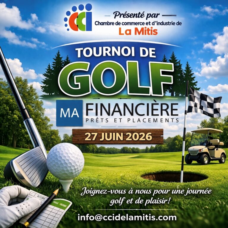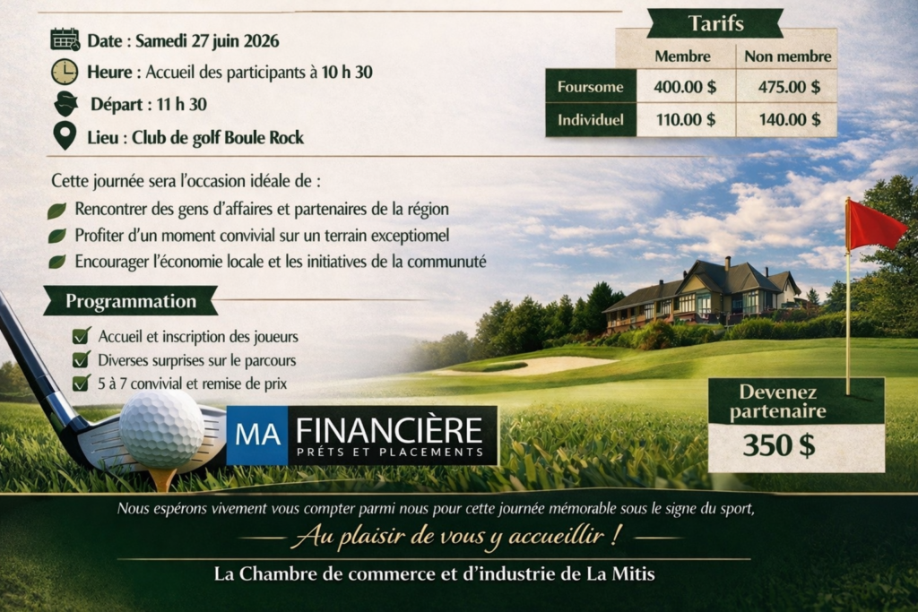 La Chambre de commerce et d’industrie de La Mitis est heureuse d’annoncer que son traditionnel tournoi de golf, qui se tiendra le samedi 27 juin 2026 au Club de golf Boule Rock avec un départ à 11 h 30, portera officiellement le nom : « Tournoi de Golf Ma Financière ».